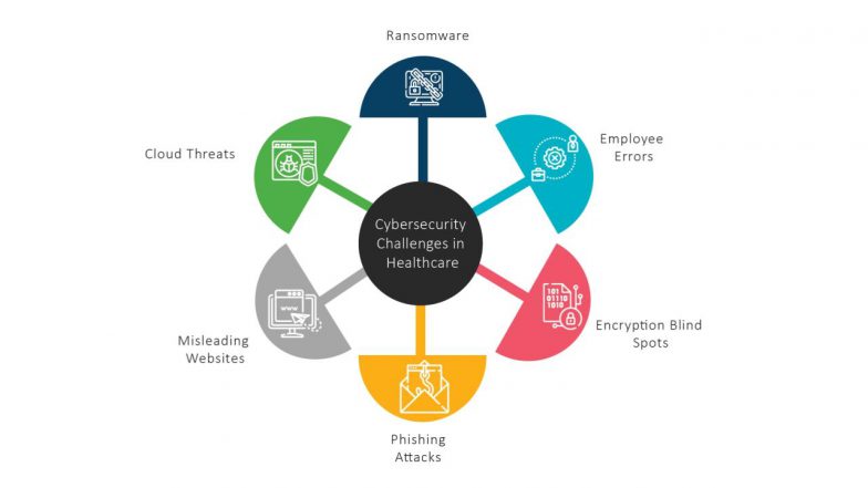 Healthcare cybersecurity challenges include ransomware, data breaches, insecure medical devices and equipment, phishing, insider threats, vulnerable legacy systems, cloud-based threats, supply chain vulnerabilities, DDoS attacks, and lack of cybersecurity awareness and education.
